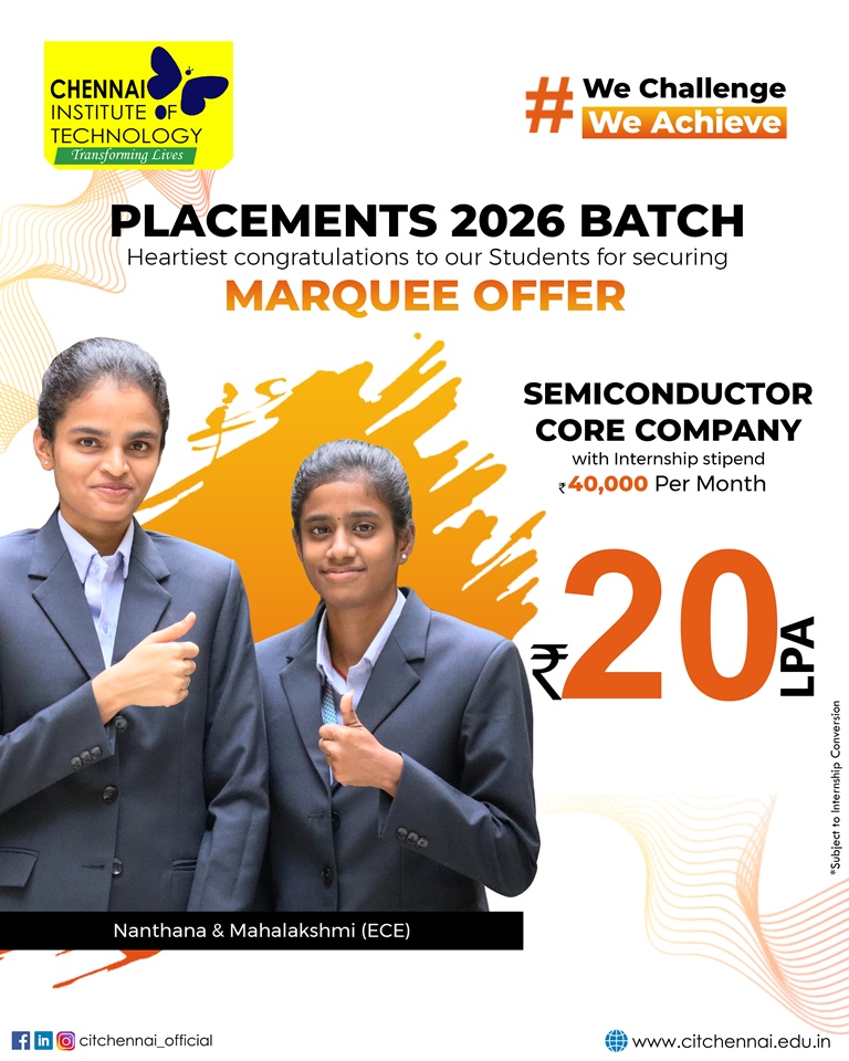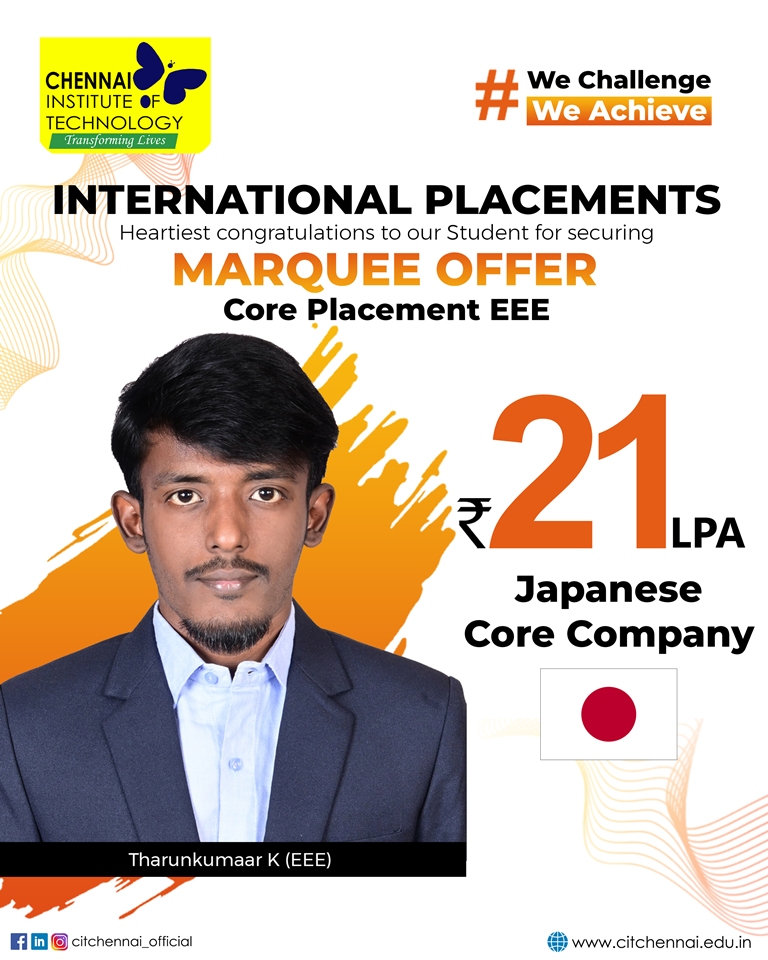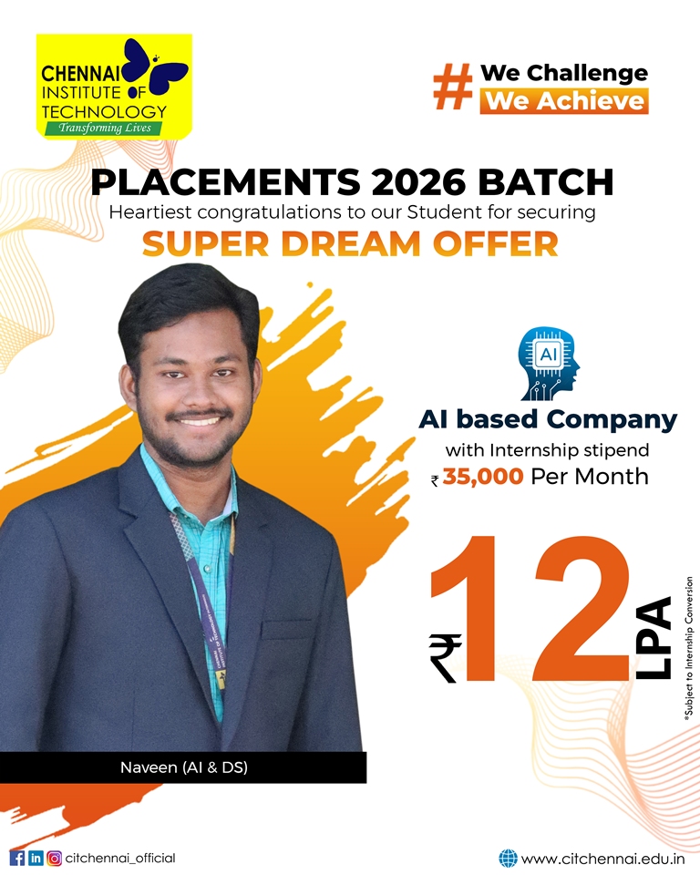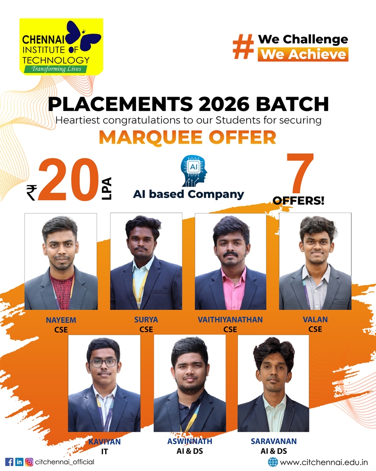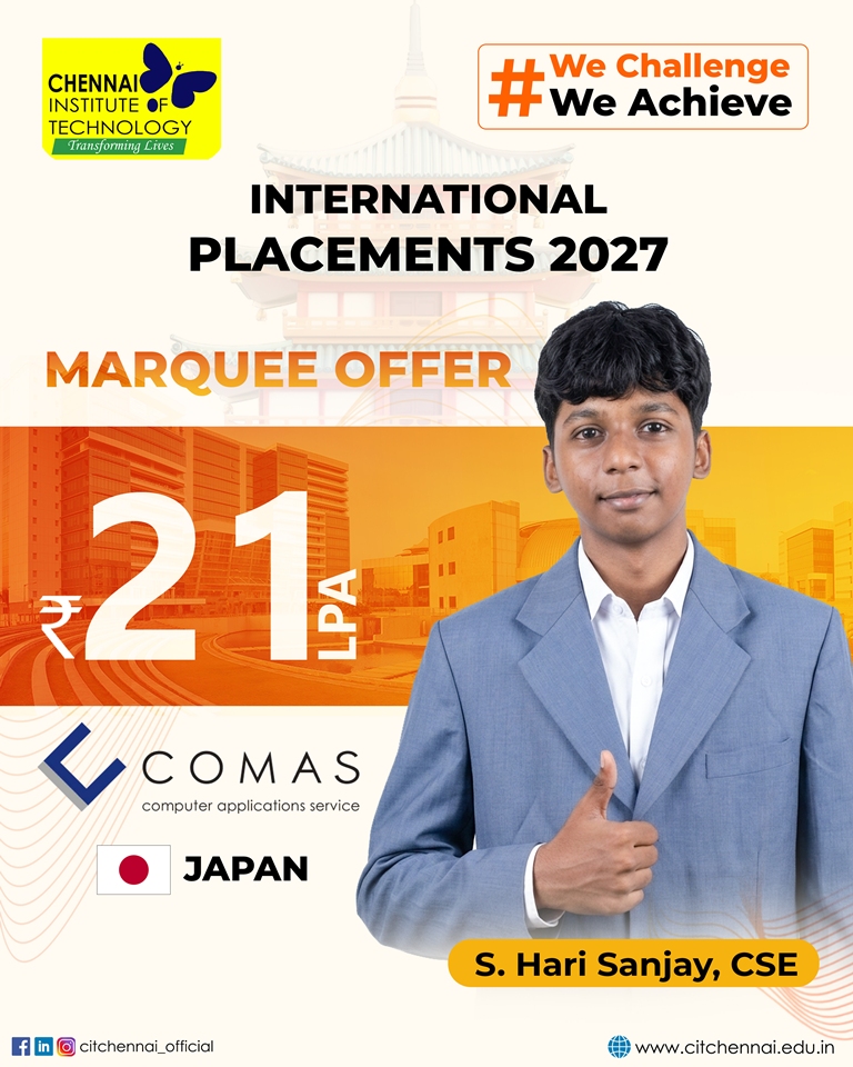 Chennai Institute of Technology attracts over 250+ recruiters from diverse domains of companies providing a wide range of opportunities through