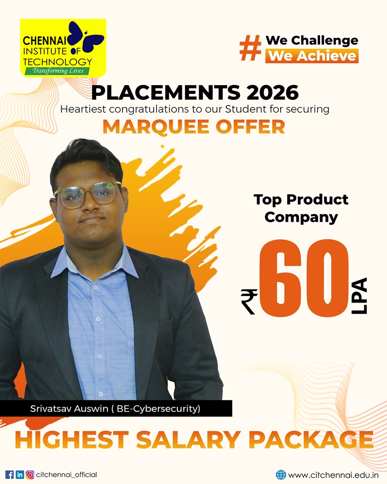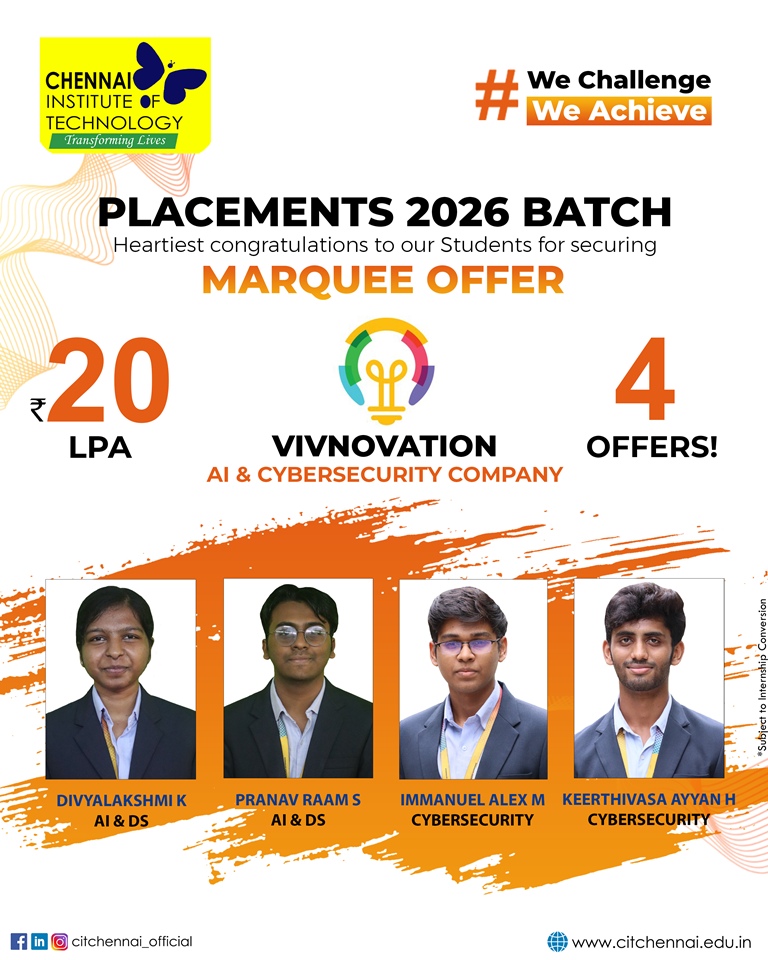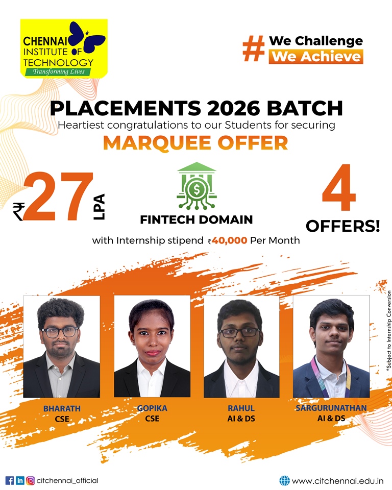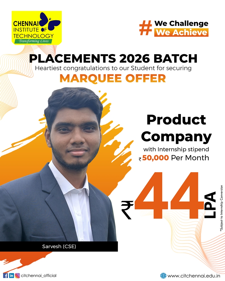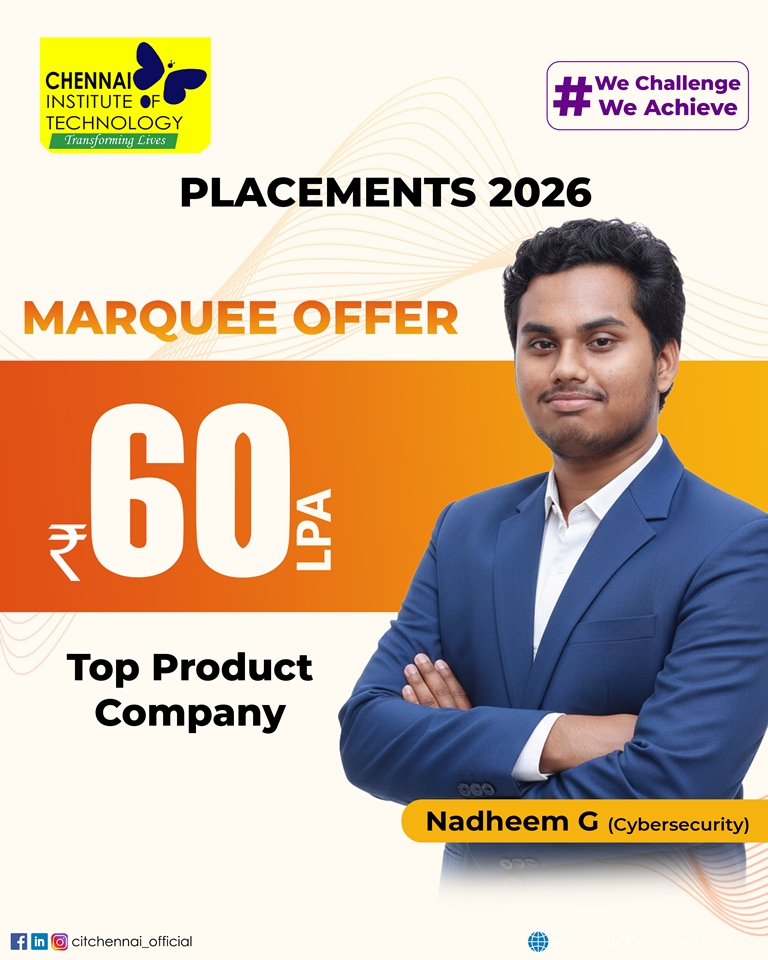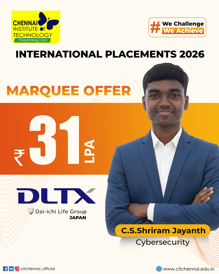Regular interactions with industry experts and our distinguished alumni network further enhance our students’ readiness for the professional world. This holistic approach has earned Chennai Institute of Technology, the distinction of being the second most preferred college among State Toppers, and a sought-after recruitment destination for global brands such as Microsoft, ServiceNow, Autodesk, Zscaler, Cisco, Juspay, Worldline, and Mr. Cooper, Tata Consultancy Services, Cognizant Technology solutions and many others.