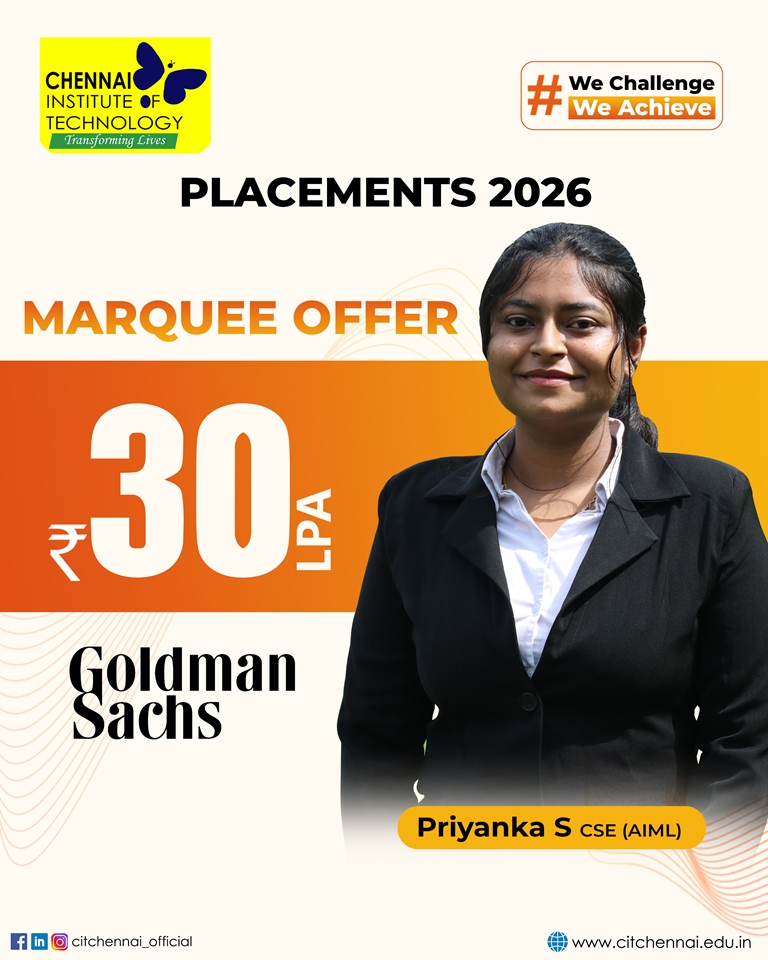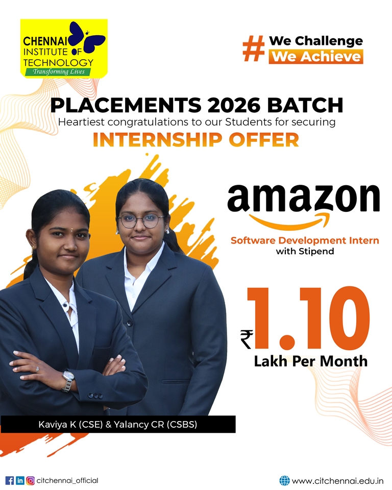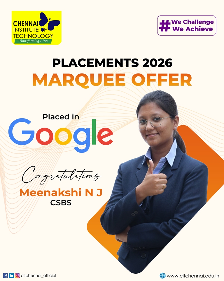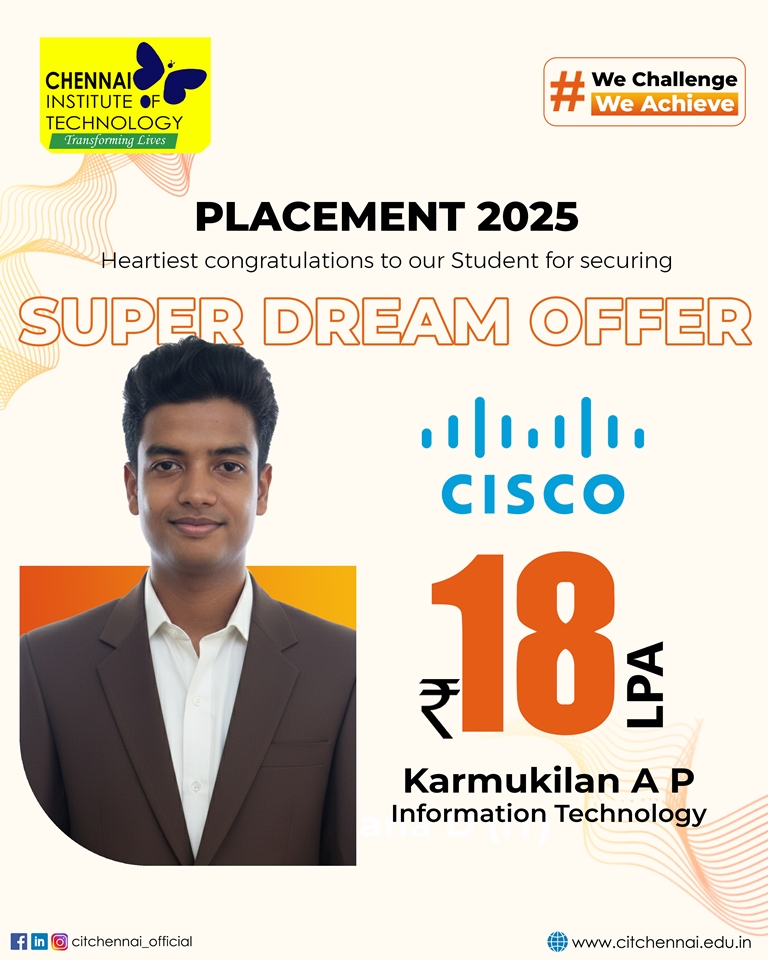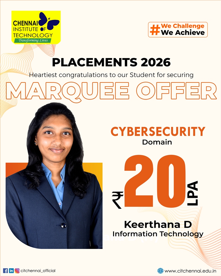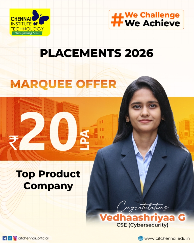 Regular interactions with industry experts and our distinguished alumni network further enhance our students’ readiness for the professional world. This holistic approach has earned Chennai Institute of Technology, the distinction of being the second most preferred college among State Toppers, and a sought-after recruitment destination for global brands such as Microsoft, ServiceNow, Autodesk, Zscaler, Cisco, Juspay, Worldline, and Mr. Cooper, Tata Consultancy Services, Cognizant Technology solutions and many others.